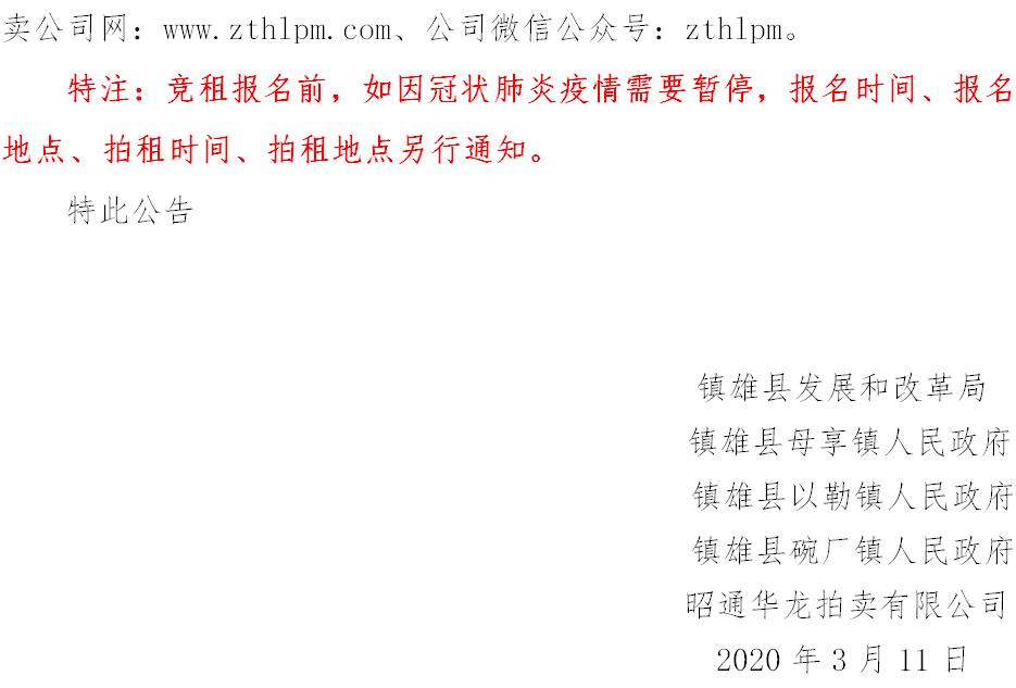 經(jīng)鎮(zhèn)雄縣人民政府批準(zhǔn),受相關(guān)部門(政府)委托,公開(kāi)拍租位于鎮(zhèn)雄縣易地扶貧搬遷工程呢嚕坪安置點(diǎn)7棟獨(dú)立商鋪使用權(quán)、高山大地安置點(diǎn)27間(棟)商鋪使用權(quán)、魯家院子安置點(diǎn)24間(棟)商鋪使用權(quán)、母享安置點(diǎn)146間商鋪使用權(quán)、以勒物流城安置點(diǎn)67間(棟)商鋪使用權(quán)、碗廠安置點(diǎn)114間商鋪使用權(quán)。相關(guān)事項(xiàng)如下: