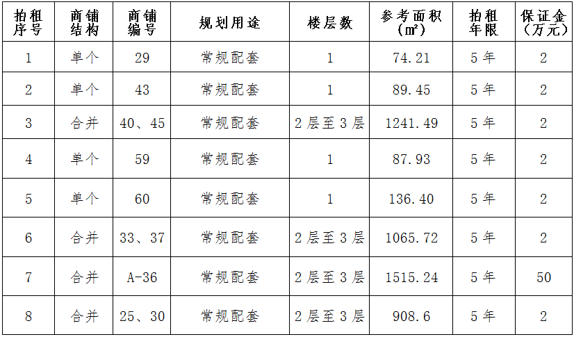 四、預(yù)交競租保證金:按商鋪簡介標(biāo)準(zhǔn)預(yù)交競租保證金。競租人交納的保證金以銀行到賬時(shí)間為準(zhǔn)(保證金交納人名稱與競租報(bào)名人名稱必須一致),截止時(shí)間2021年12月10日16時(shí)30分。成交的競租保證金轉(zhuǎn)為第一年租金的一部份,未成交的競租保證金全額退還,不計(jì)利息。